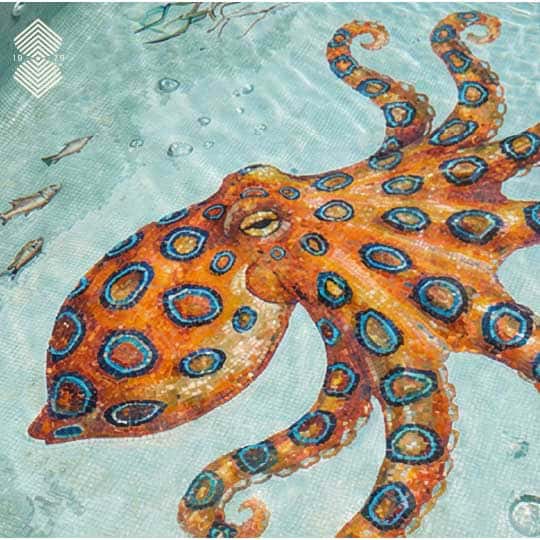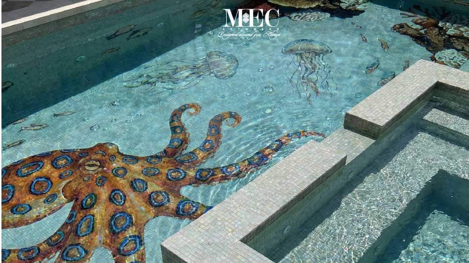 Here’s a Marine Illustration Pool Mosaic. Designed as a fully immersive underwater scene, this MEC pool mosaic showcases an octopus and marine life in rich ambers, greens, and soft aquas.