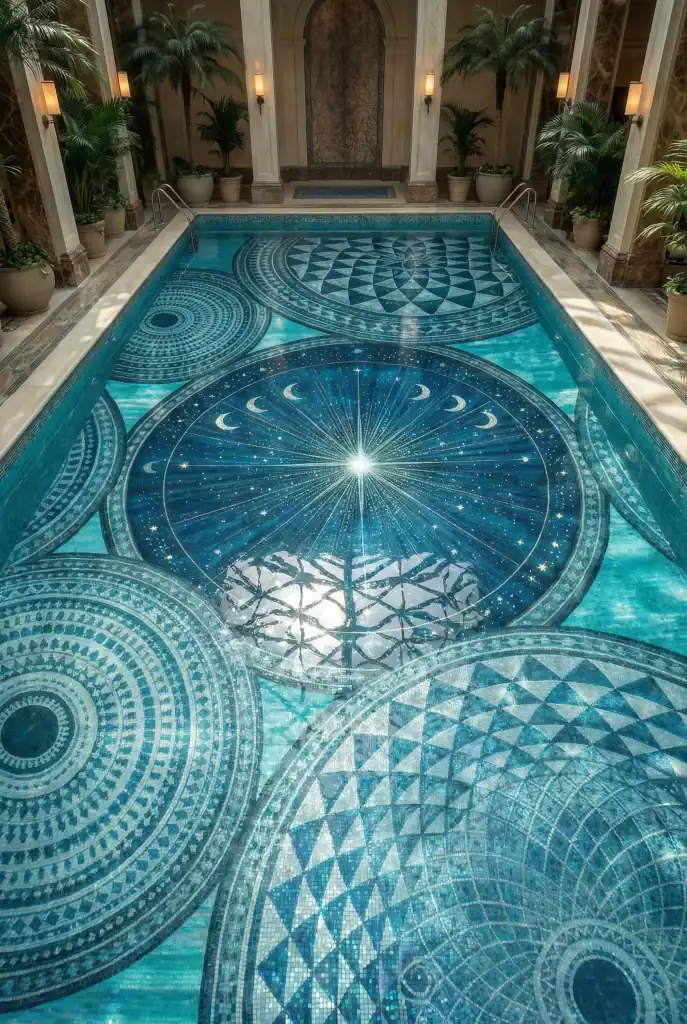 For example, this Celestial Geometric Pool Mosaic created by MEC layers deep indigo, teal, and silver tones into concentric celestial patterns inspired by astronomy and sacred geometry.