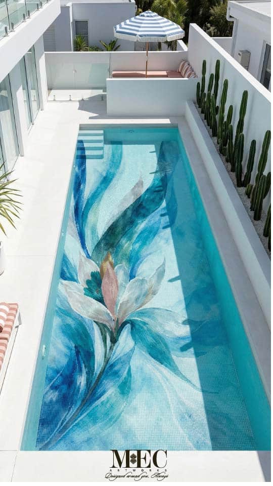 This striking MEC mosaic below transforms this modern pool into a living canvas, where a fiery, swirling form cuts through deep blue water with bold, pixelated precision.