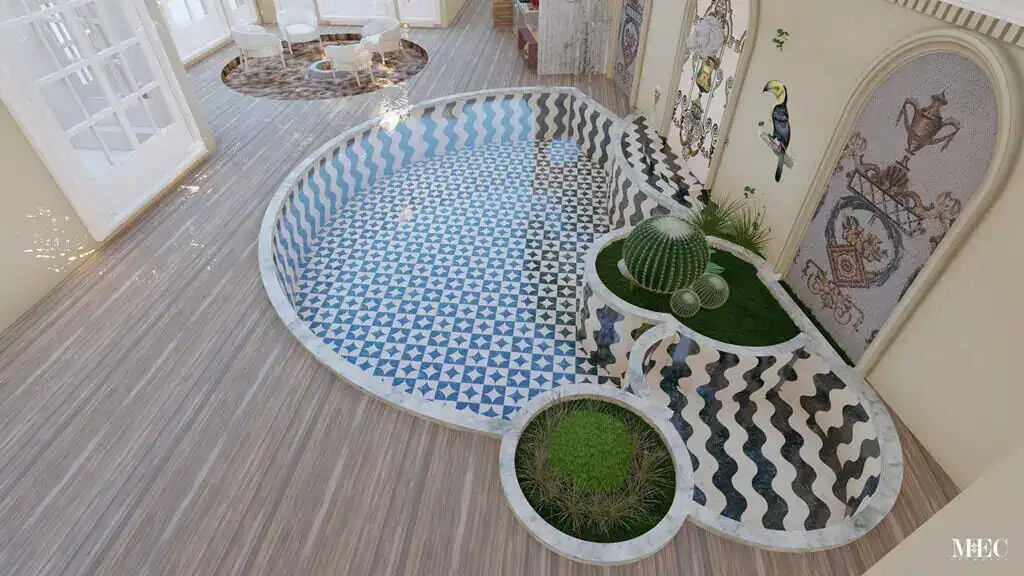 Mosaics are playing a bigger role than ever in how these bold colors are used. Designers at MEC are experimenting with pixelated mosaics, gradient fields, and layered patterns that let colors shift subtly across the pool surface.