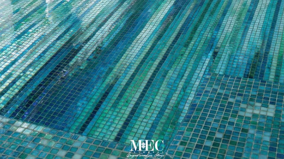 Take this Linear Teal & Jade Pool Mosaic as an example. This custom MEC pool mosaic uses layered strokes of teal, jade, and soft aqua to create a flowing, textile-like effect beneath the water.