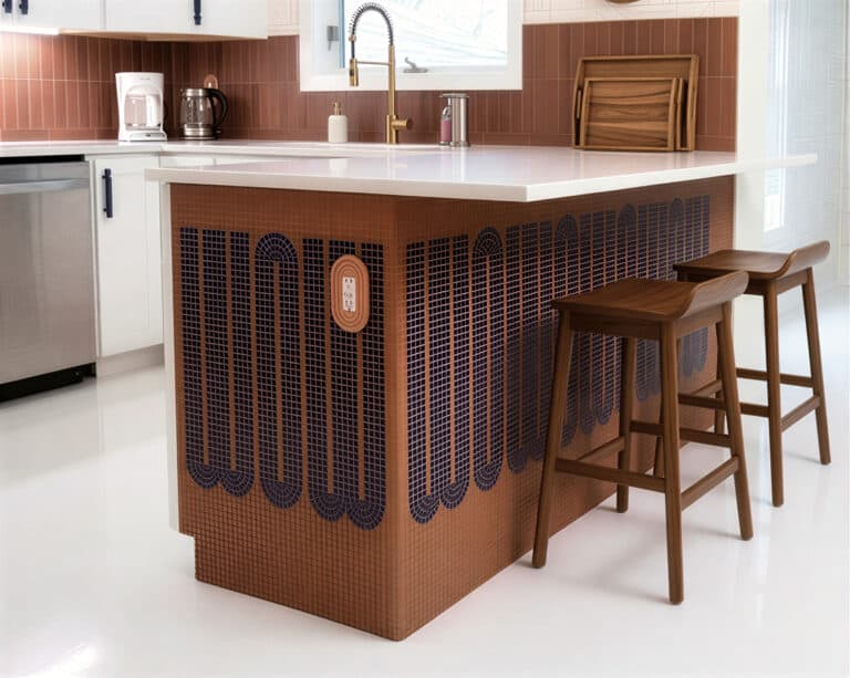 Carolyn’s 70s-Inspired Kitchen Counter Base Mosaic with Custom Lettering Set within a modern residential kitchen, this custom typography mosaic introduces