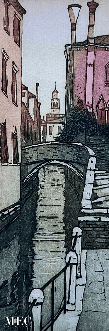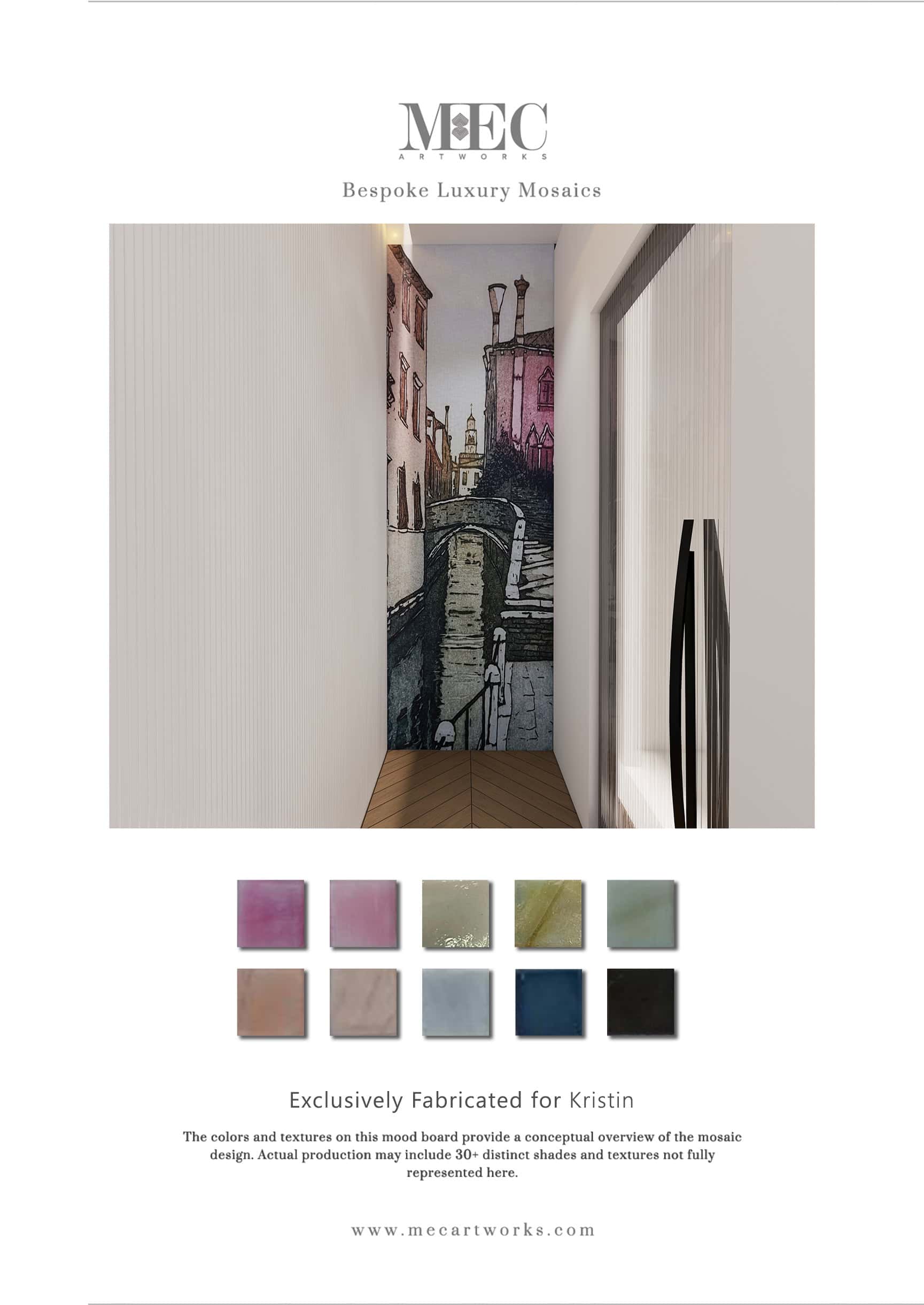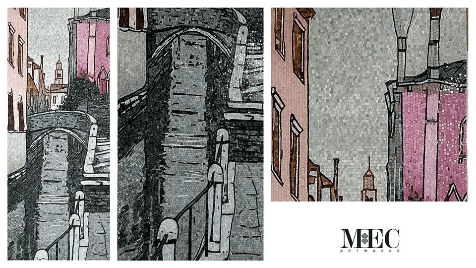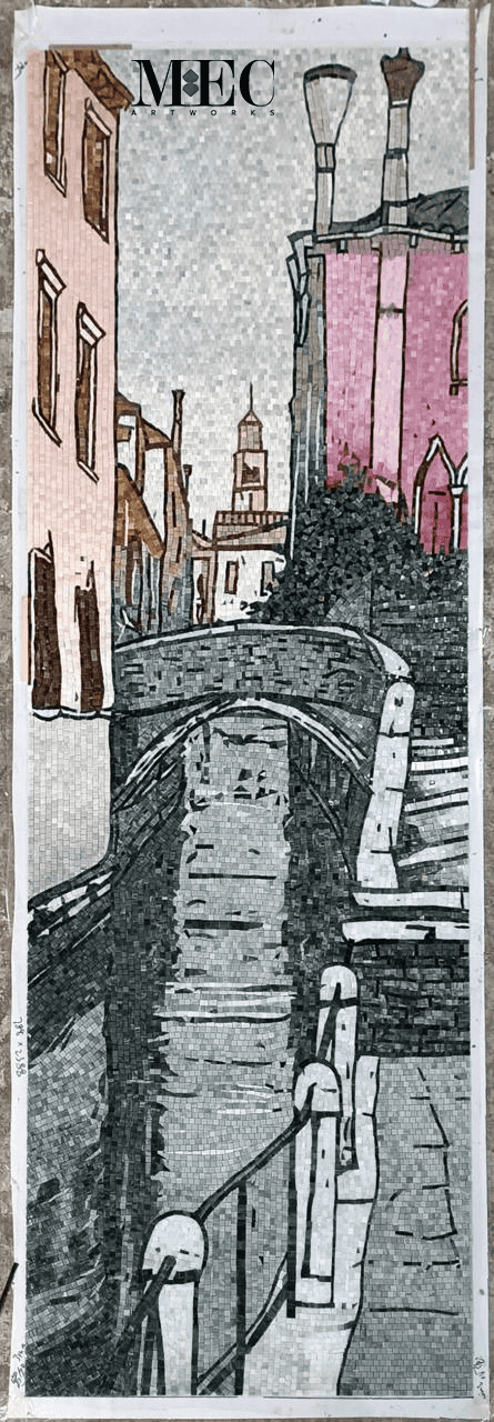 In the serene town of Woodinville, Washington, this project tells a story of passion, travel, and artistic expression. MEC was delighted to partner once again with Kristin, a discerning homeowner and returning client who had previously entrusted us with a bespoke mosaic installation. This time, she returned with a vision – inspired by a scenic photograph she captured during a trip to Venice, Italy. The photo, showcasing soft pinks, corals, and the gentle reflection of heritage architecture over a tranquil canal, sparked the beginning of this exquisite mosaic journey.
