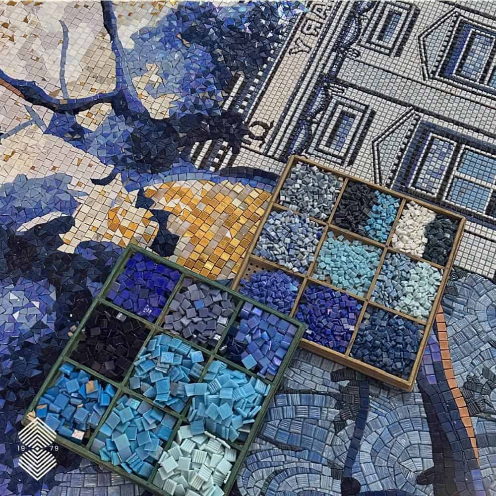 The design for this mosaic was shaped by a mix of cultural and artistic influences. The town’s architecture took cues from vintage European buildings, specifically those from the 18th and 19th centuries. We looked at how façades were structured, worked out the process of translating it onto mosaic, the patterns of windows and balconies, and the understated details that gives historic towns their character. These minute details helped create a sense of authenticity in the streetscape.