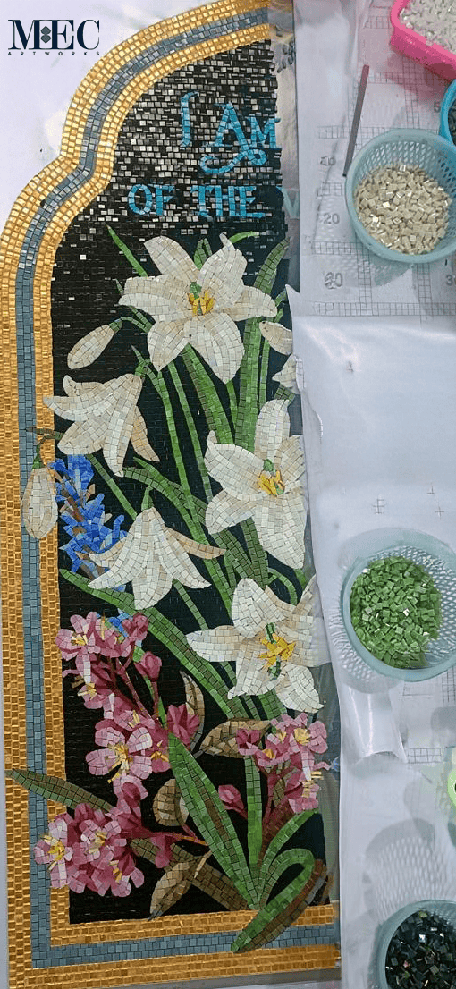 - Soft White and Cream Mosaic Pieces for the lilies: Symbolizing purity and spiritual bloom, these tones gave the lilies a delicate, radiant presence at the heart of the mural.