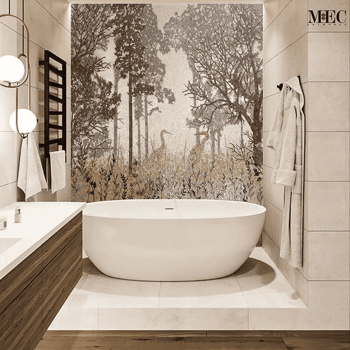 Kristin’s vision began with a reference from MEC’s own portfolio; the Misty Forest Heron Mosaic Mural. She was captivated by its ethereal atmosphere, where distant forest trees fade into a foggy morning light and graceful herons appear almost ghostlike in the mist. The muted color palette, intricate layering, and lifelike depth of that artwork spoke to her desire for a peaceful, nature-driven design. Kristin envisioned this piece not simply as decoration, but as an experience – something to be quietly enjoyed during a warm bath, with tones that reflect both natural tranquility and refined luxury.