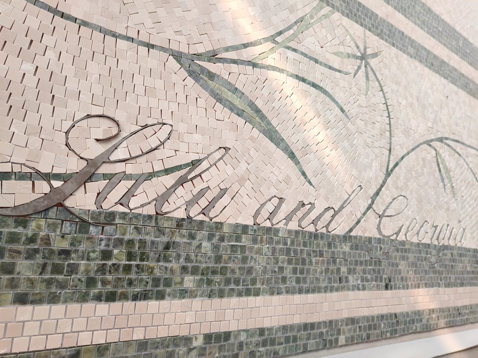 The mosaic was planned for a large entry area of roughly 200 square feet, making it an important visual feature for visitors walking into the space.