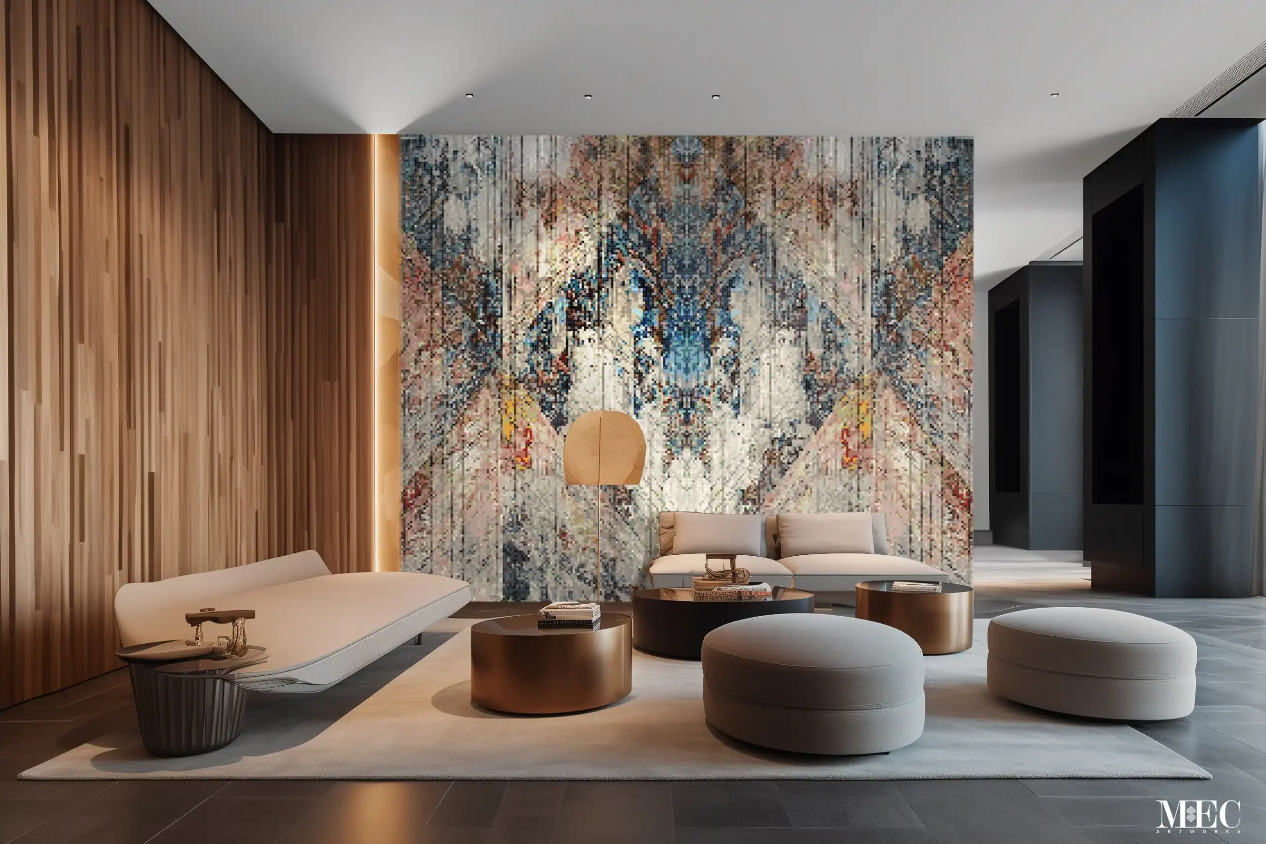 This abstract mosaic mural brings the drama of modern art into architectural spaces. Designed with a striking symmetrical layout, the mural features layered patterns in shades of blue, ivory, blush, and earthy tones. The effect is both bold and refined, making it a captivating feature wall for living rooms, lobbies, galleries, and modern residences.