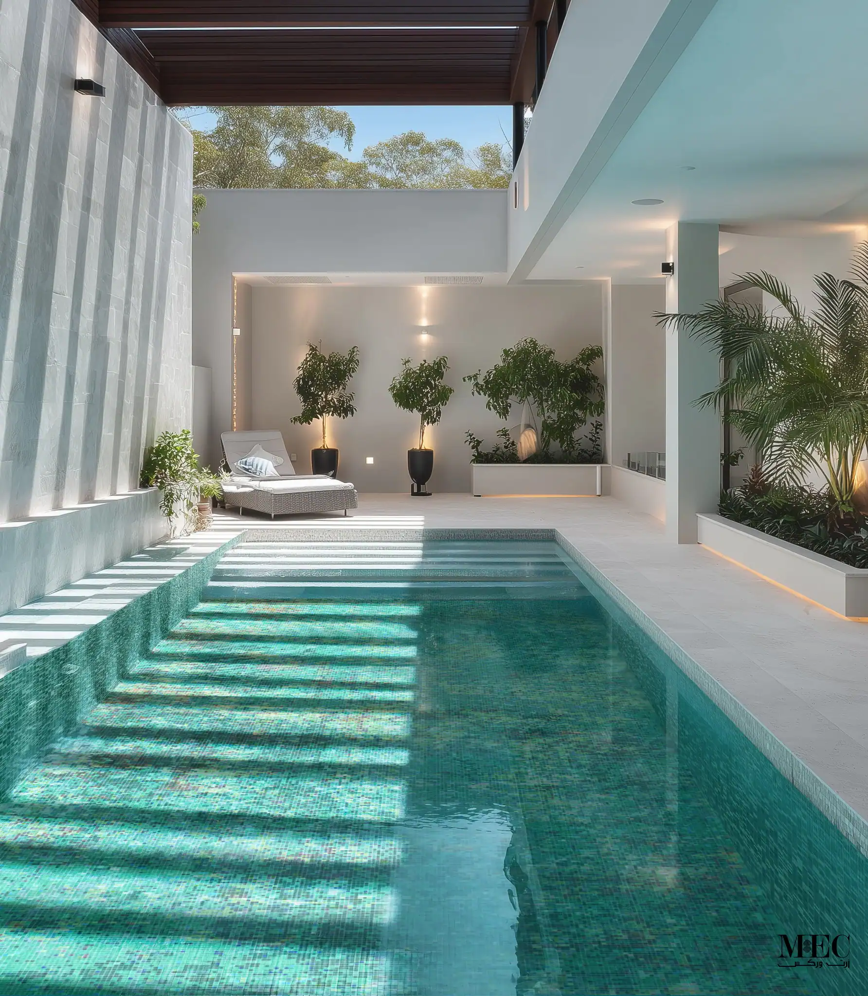 Shadows from the overhead beams fall across the pool in neat stripes, creating a layered effect. This design makes the pool look structured and artistic at the same time.