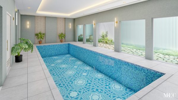 • Geometric Borders: The pool floor features repeating geometric borders along the edges, framing the central pattern and adding a sense of structure.