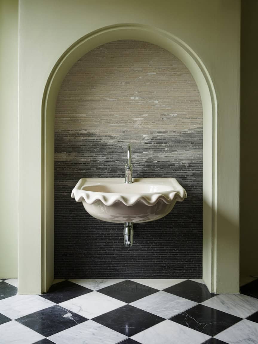 The Ash Veil Mosaic blends vintage charm with refined modernity. Featuring a smooth gradient of taupe transitioning into deep charcoal, the mosaic wall creates an elegant focal point within the arched alcove. The sculptural basin, reminiscent of a seashell with its fluid ruffled edge, adds a playful yet sophisticated touch to the space.