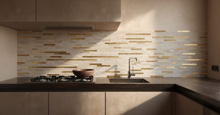 The Auric Linea Mosaic brings understated luxury to this modern kitchen. Slim rectangular tiles in soft ivory and beige tones are punctuated with gleaming gold accents, creating a harmonious rhythm that catches and reflects light beautifully. The metallic detailing adds warmth and sophistication without overwhelming the minimalist aesthetic.