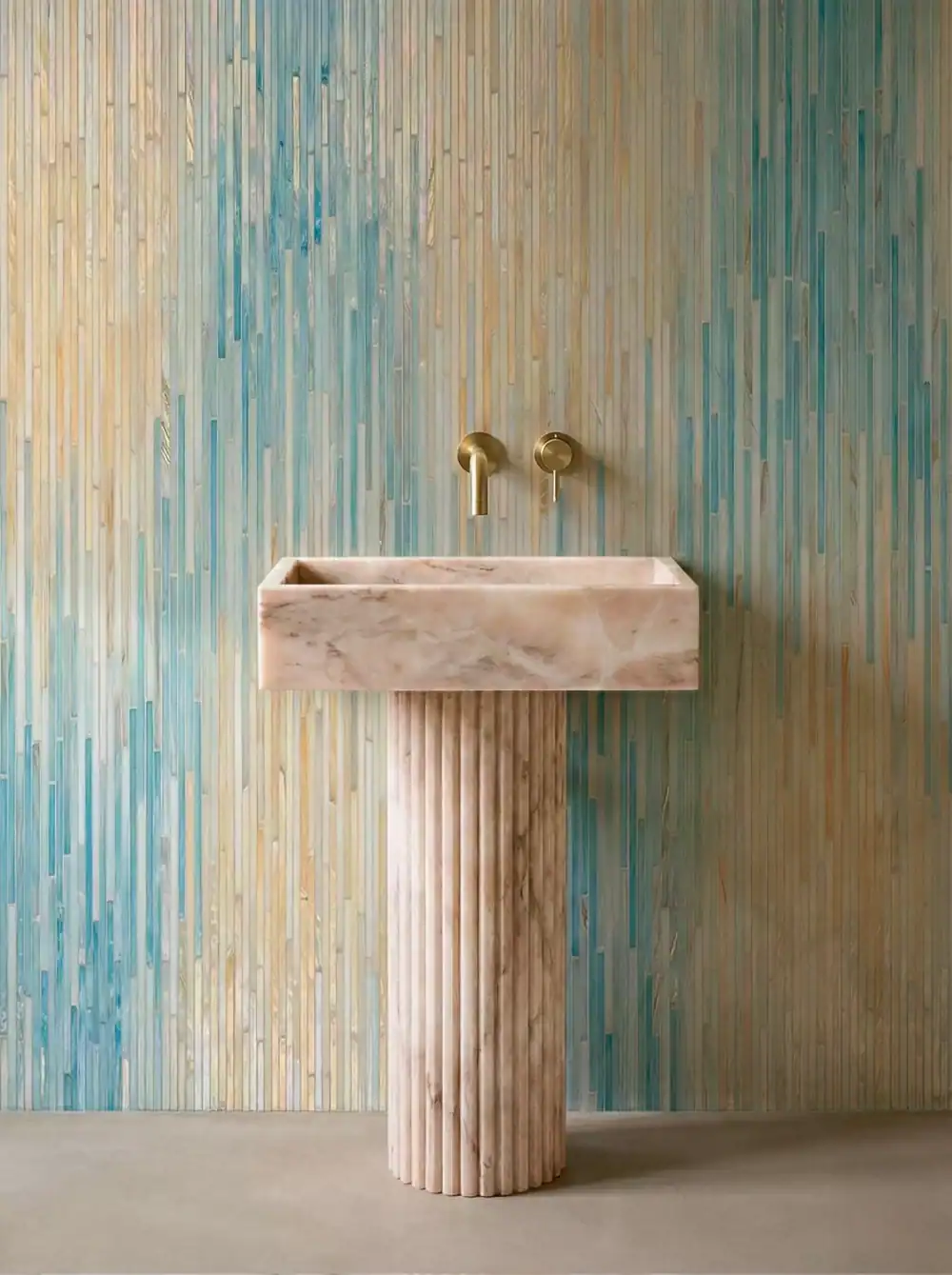 This ombre stick mosaic wall delivers a soft, vertical gradient that feels light, fluid, and effortlessly elegant. The mosaic blends airy sand, pearl, and champagne tones with tranquil aqua and sea-glass blues, creating a veil-like transition across the surface. Slim vertical mosaic sticks enhance height and rhythm, while the gentle color layering gives the wall a refined, gallery-style presence. The result is a vibrant yet calming mosaic masterpiece that elevates modern interiors.