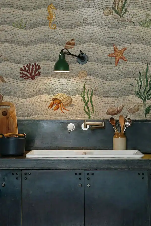Inspired by ocean ecosystems, this mosaic embraces biophilic design by introducing natural marine elements into the built space. The vibrant underwater mosaic pairs beautifully with modern cabinetry while adding warmth and personality.