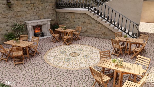 There is something timeless about serene cobblestone courtyard spaces. A designer from Beirut wanted something unique and handmade for a courtyard sitting area for an eatery he is working on. The space is planned to feature a natural stone tile facade, a fireplace area, a hand forged wrought iron railing and wooden garden furniture. Marble mosaic floor medallion fits in so wonderfully with slate tiles on the wall and cobblestone. Marble but in a more refined form and an intricate ornamental design creates a lovely textural contrast as well. The original Blaise marble mosaic floor medallion had a dark colorway. It has been customized for this specific project.