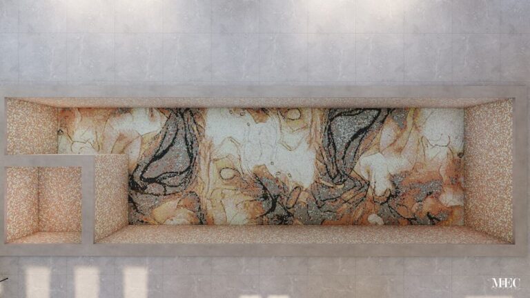This mosaic design, crafted with PIXL’s Vertex20 tiles, showcases an gorgeous blend of light and dark browns on a clean white background. The design mimics the serene beauty of ink diffusing in water, creating a soothing and unique visual effect.