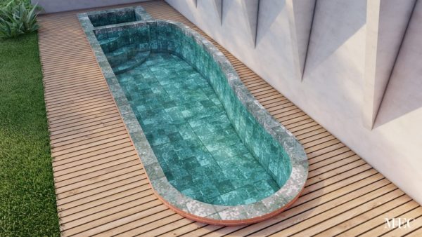 - The Bryla Blocks Mosaic Swimming Pool features a unique and modern tile design that enhances any outdoor space.