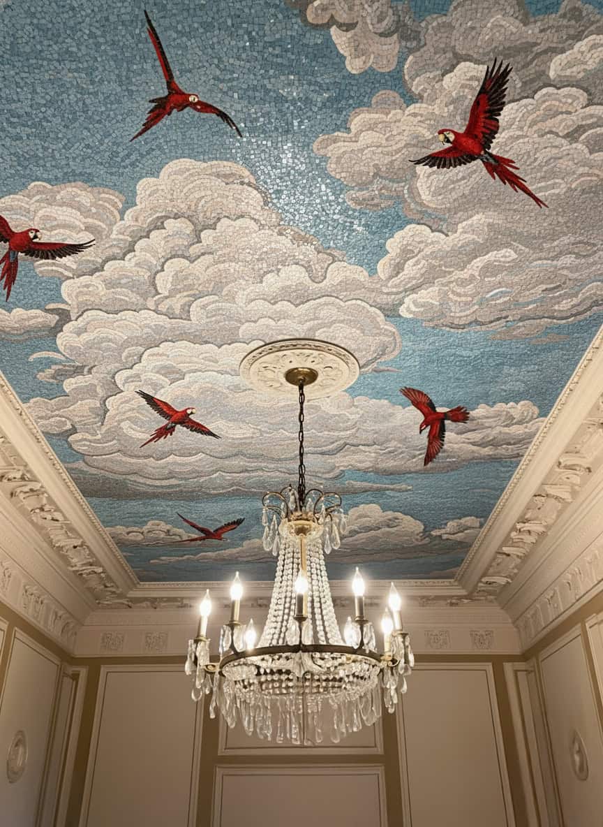 The Celestial Flight Mosaic Ceiling is a stunning fusion of classical architecture and artistic mosaic design. It transforms the ceiling into a breathtaking sky scene, where soft clouds drift across a serene blue expanse while vivid red parrots soar gracefully above. Each tiny mosaic tile captures light differently, creating movement and depth that make the ceiling feel alive and open.