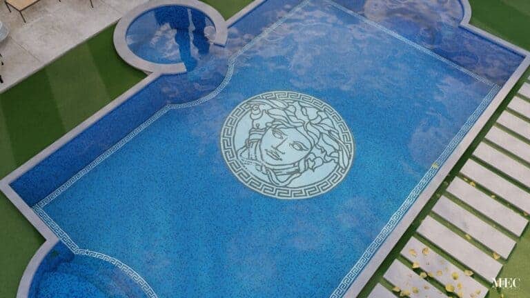 - Medusa Head Motif (Versace Influence) – The centerpiece of the pool is the Medusa head mosaic, a signature design of Versace, symbolizing power, beauty, and elegance.