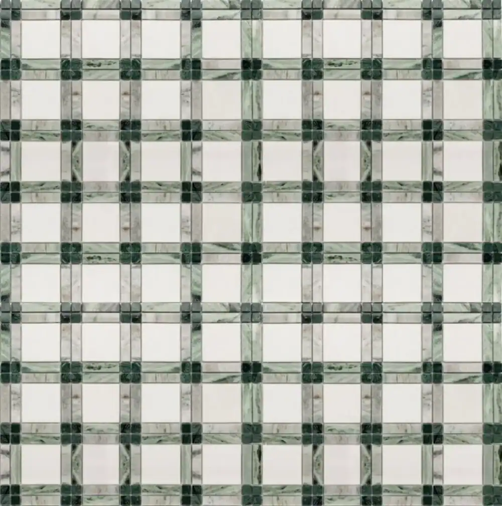The Classic Tartan Grid Mosaic blends geometric precision with natural marble artistry. Inspired by the symmetry of traditional plaid and lattice designs, it features intersecting green and white marble bands forming a refined checkered grid. The subtle interplay of colors and textures makes it an elegant choice for both contemporary and heritage-inspired spaces.