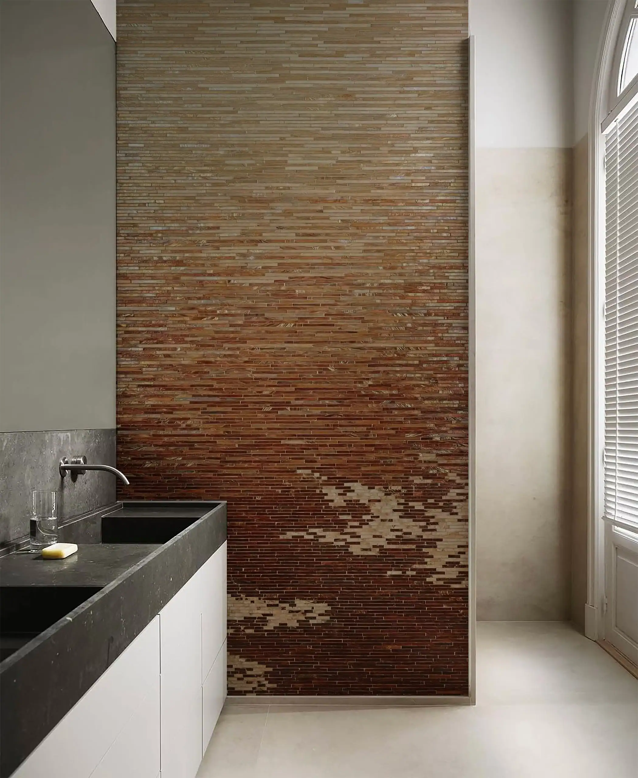 The copper ombre mosaic wall shifts from light beige to deep brown in a smooth transition. The fade feels natural, like desert sand turning into rich earth. - Slim Horizontal Mosaic Pattern: