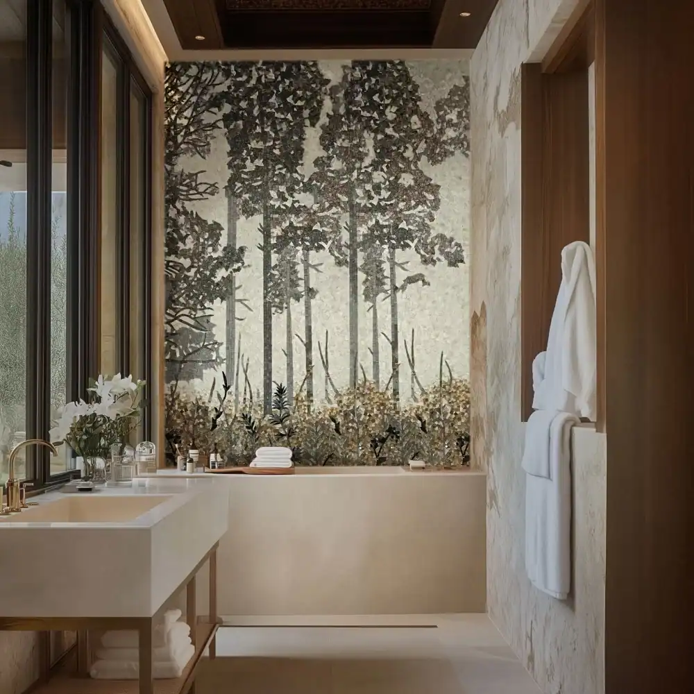 This custom mosaic mural captures the quiet majesty of a forest, transforming a bathroom wall into a serene woodland scene. With tall tree silhouettes, layered foliage, and earthy tones, the mural brings the calm and grounding presence of nature into interior spaces.