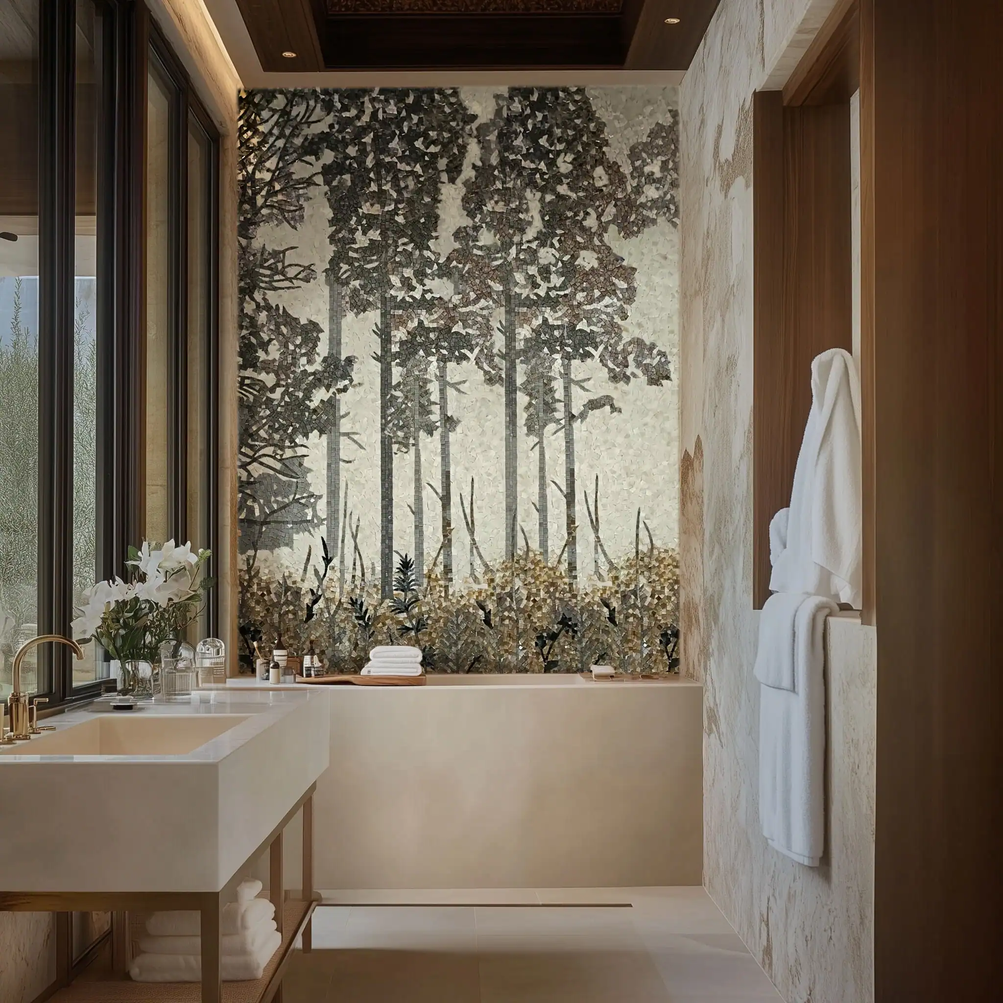 This bespoke mosaic mural captures the quiet beauty of nature, with tall tree silhouettes rising above textured foliage. The layered composition creates depth and shadow, turning the wall into a serene landscape that enriches the interior.