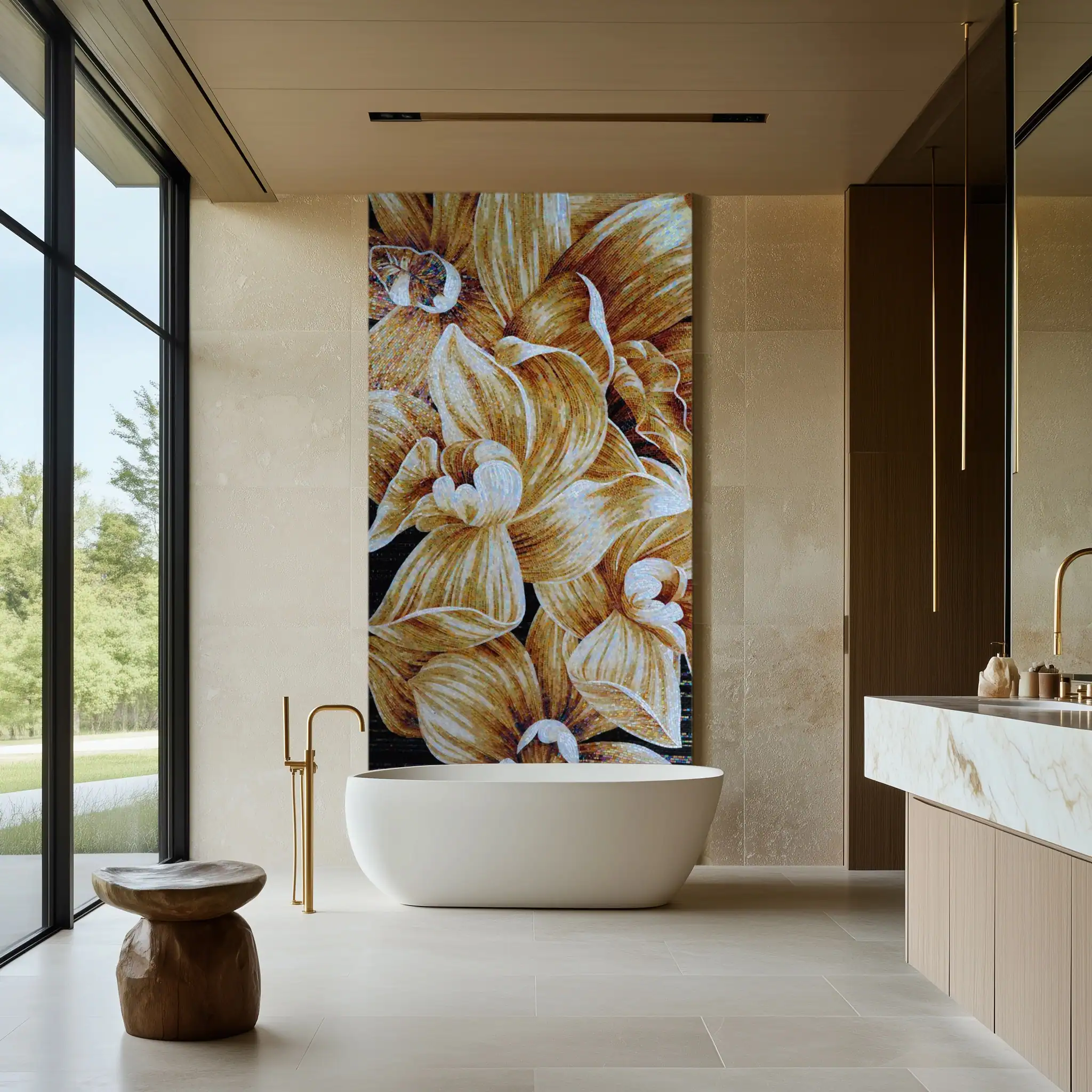 Step into refined luxury with this bathroom, where a bold golden floral mosaic becomes the centerpiece of elegance. Positioned above a sleek freestanding bathtub, the design fuses artistry with functionality, turning the bathing space into an immersive sanctuary. The warm tones of the floral mosaic harmonize with the neutral stone walls and modern fixtures, creating a timeless atmosphere of sophistication and comfort.