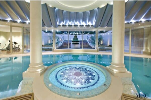 • The surrounding gradient of blue tones enhances the illusion of depth, making the water appear more dynamic and inviting. The intricate patterns reflect light beautifully, giving the pool a shimmering and elegant finish.