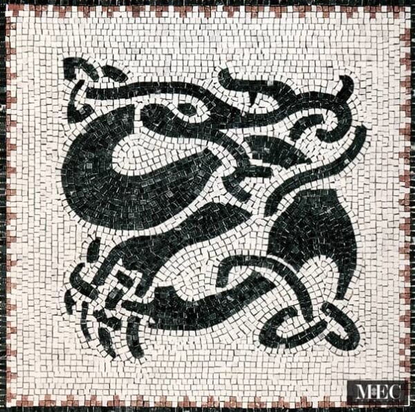 The detailing in this mosaic is exceptional. Each small stone tile has been meticulously arranged to follow the curves and contours of the dragon’s body. The design includes sinuous tendrils, spiraling tails, and clawed limbs, creating an expressive, near-animated composition. The negative space around the dragon accentuates its form and lends the piece a strong sense of depth. The pattern cleverly uses light and dark to create motion and texture within the confines of a traditional Roman-style mosaic technique.
