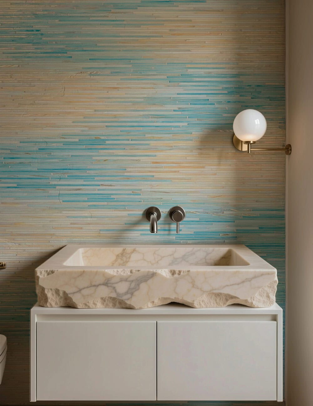 This linear glass mosaic blends sandy neutrals with calming aqua tones. The slim mosaic sticks add texture without visual heaviness. It creates a tranquil yet luxurious vanity backdrop.