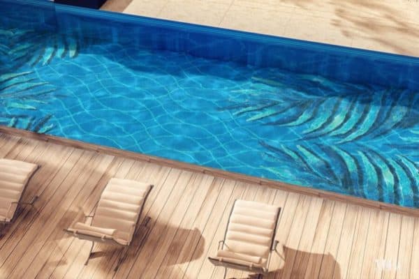 Bring some of that tropical rain forest vibe to the swimming pool with Elysian PIXL mosaic. Elysian features magnificent realistic tropical leaves. The classic blue background with a subtle overlapping wavy line pattern creates an enchanting design.