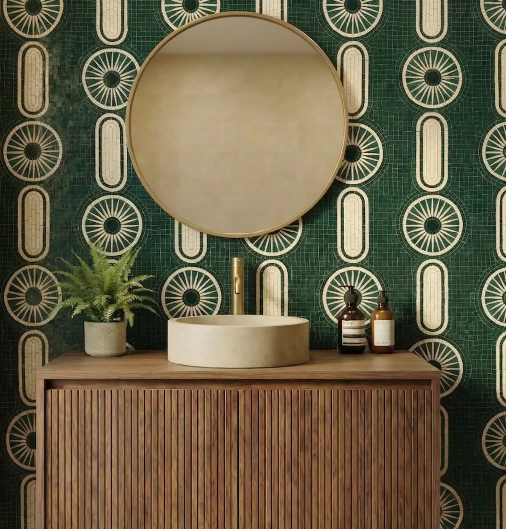 Bold emerald mosaic with art deco geometry. Creates a luxurious and refined vanity feature. Perfect for modern bathrooms and interiors