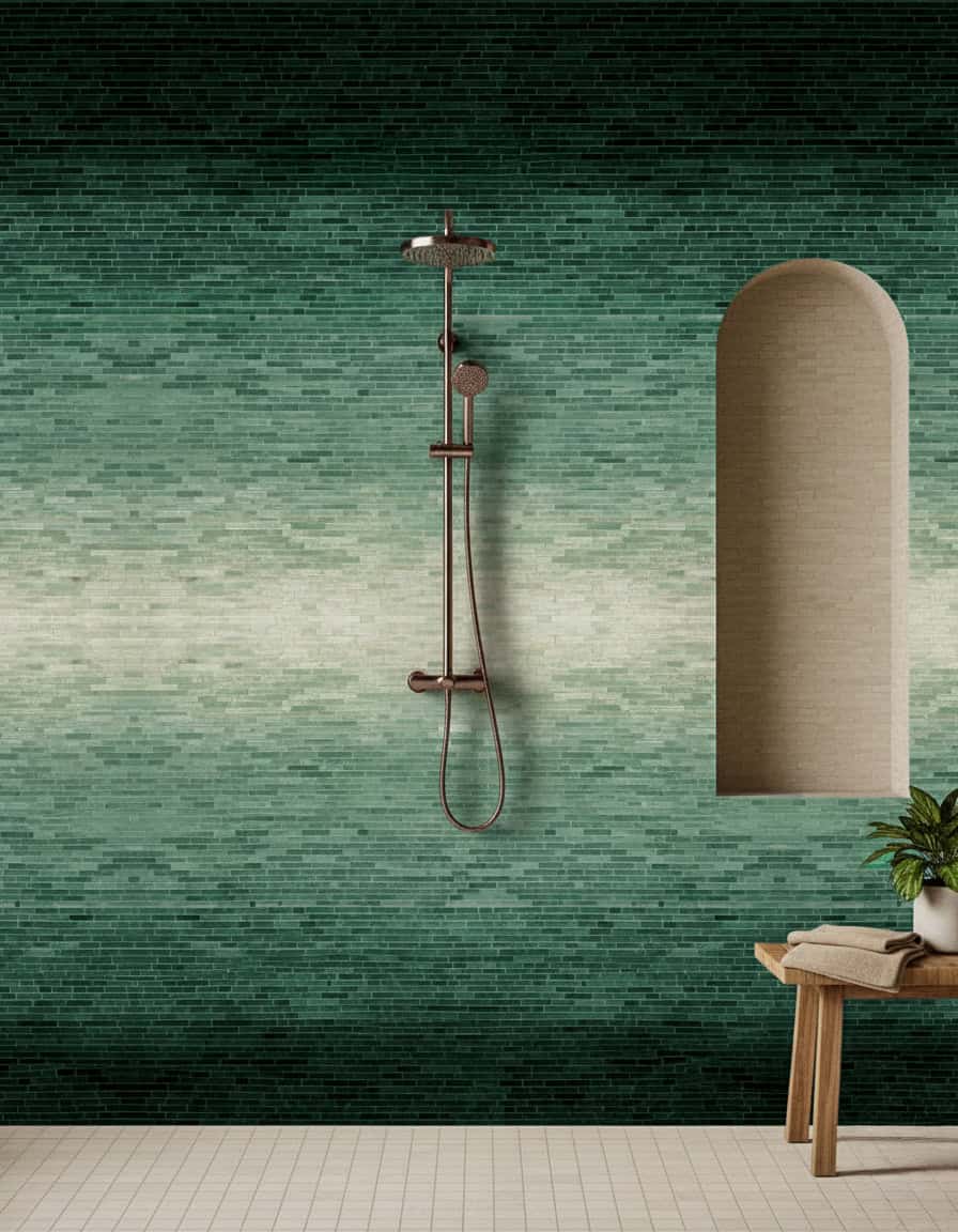 The Emerald Tide Mosaic evokes the quiet rhythm of ocean currents and the meditative flow of water meeting shore. Crafted from hand-cut glass tesserae in a seamless ombré gradient, this mosaic brings depth, tranquility, and refined movement to modern interiors. Its deep emerald tones fade gracefully into soft jade and mist, capturing the calm essence of nature through timeless craftsmanship.