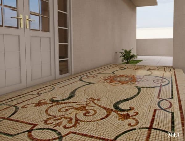 Did you know that mosaic tile patterns have been embellishing entrances of homes and other buildings for centuries? Mosaic is the medium of choice for floor decoration and fortification for many reasons. It is durable. So much so that mosaics from hundreds of years ago have bee uncovered by archeologists in a decent condition. Furthermore you can arrange differently colored tile pieces into infinite patterns & design combinations. An MEC client from Algeria recently got a beautiful marble mosaic rug pattern for their home’s entrance. The image you see is a render. We prove complimentary 3D mosaic tiles renders based on project needs.