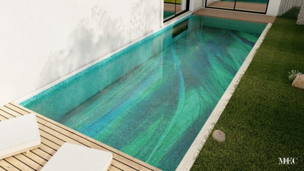 The Floyan Mosaic Pool Tile transforms your pool into a luxurious retreat inspired by the ocean. The green and blue iridescent mosaic tiles create a wave-like effect. The rectangular shape adds modern style, ideal for relaxation or swimming laps. A flush water level, like an infinity edge or hidden drainage, ensures smooth water flow and enhances the pool’s sleek design.