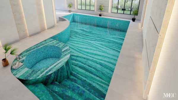 Fujiwa Wave mosaic seems to be a popular choice in 2022. This is our third Fujiwa Wave glass mosaic swimming pool this season alone. This time however, the mosaic pattern has be tweaked on customer?s request. They loved the wave mosaic pool design but wanted it to have more of an ombre effect. So this time rather than randomly colored waves, they have been arranged in a way that the colored glass moves from darker to lighters as we move towards the center of the pool floor.