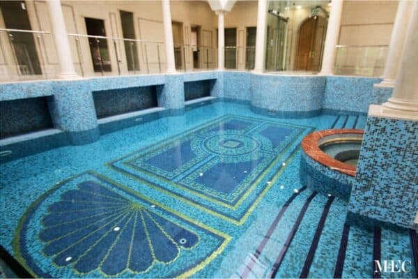 This pool design evokes the opulence and geometric artistry of the Art Deco era, often associated with the “Gatsby” style. It features distinct mosaic tile patterns creating a luxurious and visually striking aquatic space.