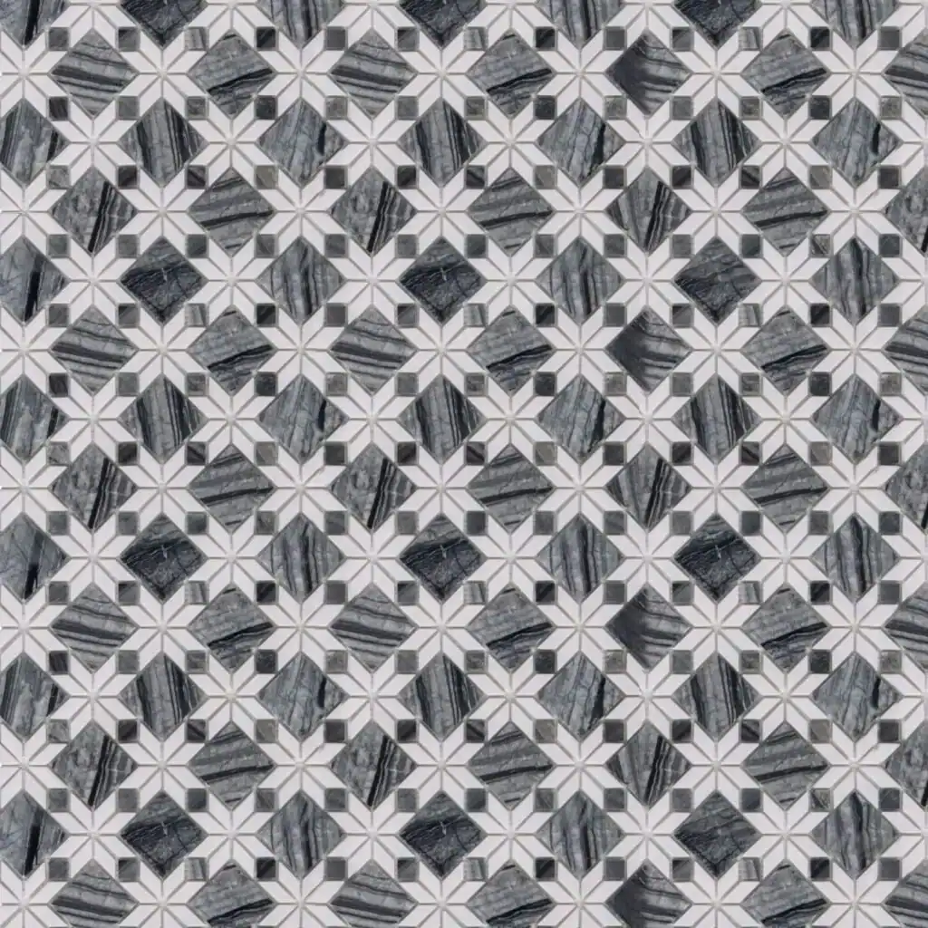 The Geometric Flower Marble Mosaic blends natural stone beauty with timeless artistry. Designed with grey marble diamonds arranged into floral-inspired motifs, this mosaic creates a sophisticated surface full of rhythm and detail. The combination of textured grey veining against a white backdrop offers balance, elegance, and a sense of refined movement, making it perfect for both modern and classic interiors.