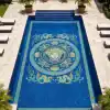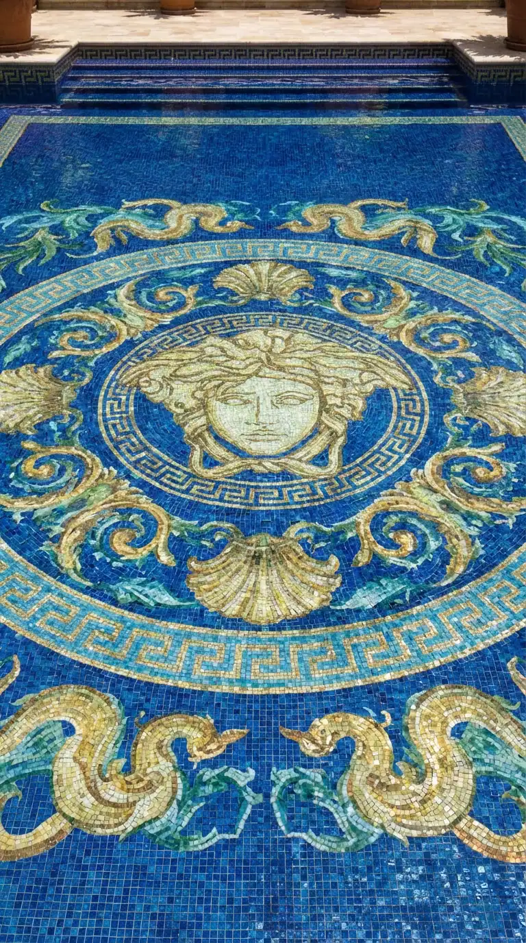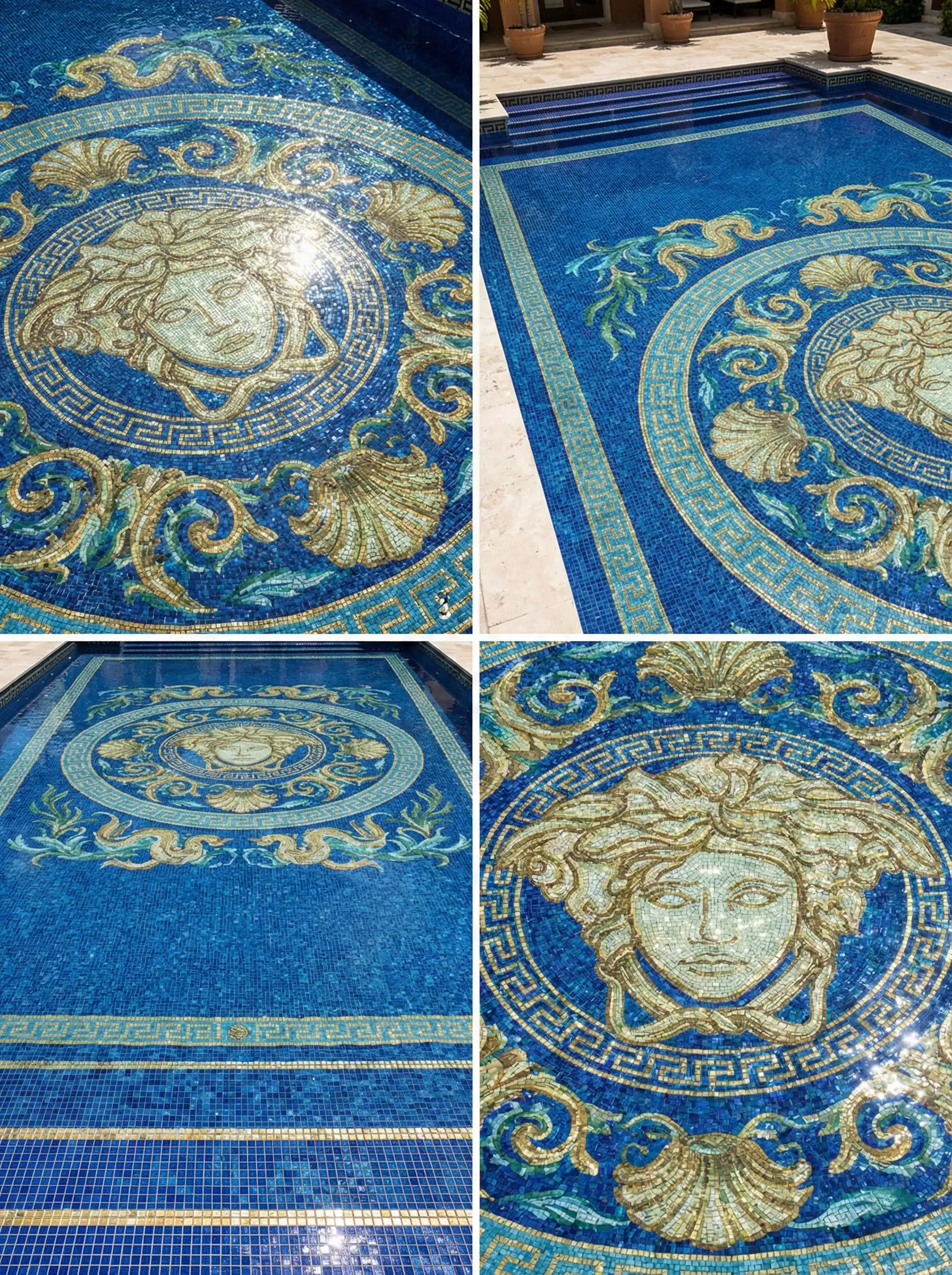 This pool mosaic uses a bold classical medallion to create a rich designer finish. The border and shell accents add a strong Mediterranean identity. It suits luxury outdoor pools that want timeless heritage-style artwork.