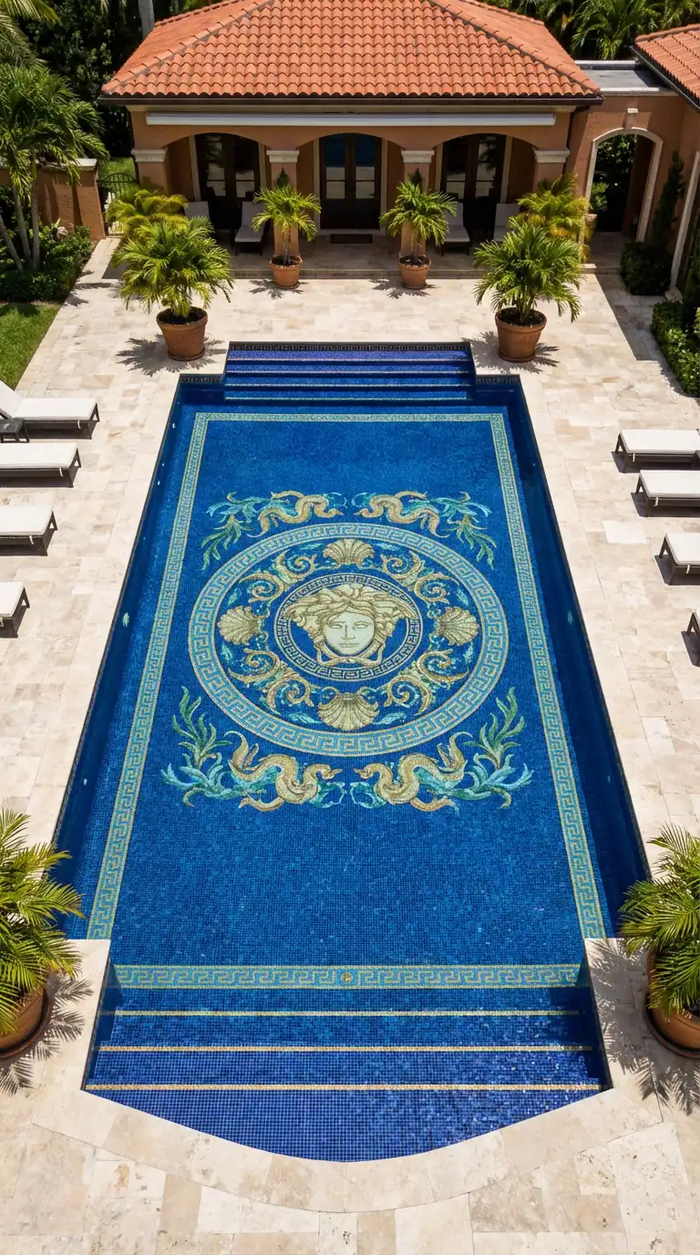 This luxury pool mosaic design features a bold classical centerpiece inspired by ancient Greek and Roman art. The deep blue tile base holds a large circular medallion with a Medusa-style face motif, surrounded by shells, wave-like scrolls, and decorative flourishes. A Greek key border frames the entire pool floor, giving the design a grand, heritage look that feels timeless and highly premium.