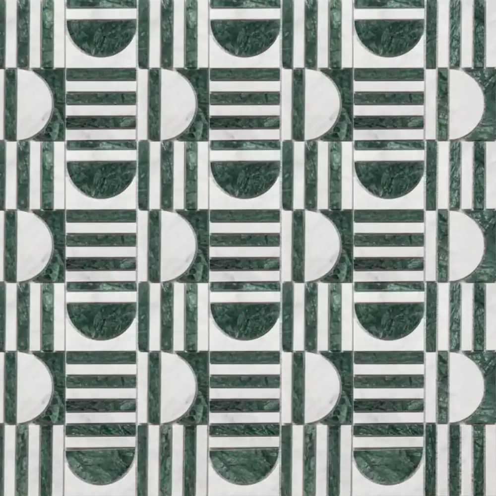 The Green & White Art Deco Mosaic embodies the elegance of vintage design reimagined for modern interiors. Featuring bold geometric forms — half-circles and linear stripes in deep green and crisp white marble — this mosaic celebrates balance, rhythm, and symmetry. Perfect for creating statement surfaces, it captures the refined glamour of the Art Deco era with a fresh, contemporary edge.