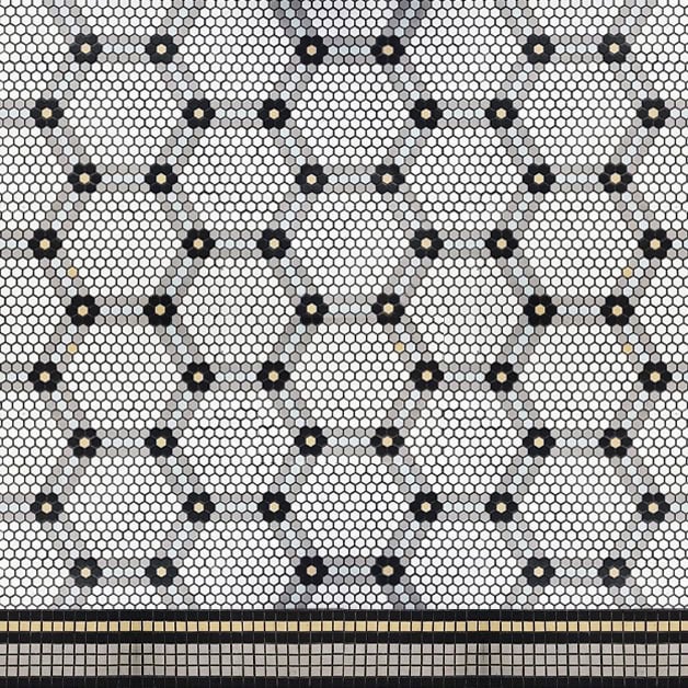 The Hex Mosaic beautifully captures a timeless charm through its small hexagonal tiles arranged in a classic black-and-white flower motif. Subtle touches of gold and grey enhance the pattern’s nostalgic appeal, while the border detailing adds a refined finish. Perfect for traditional bathrooms, heritage-inspired kitchens, or café floors, this mosaic brings elegance, history, and character to any space.