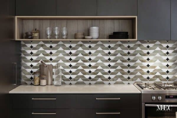 - Interlocking Shapes: The design features a pattern of interlocking shapes, including triangles and rounded segments. These shapes create a sense of movement and dynamism, adding visual interest to the backsplash.