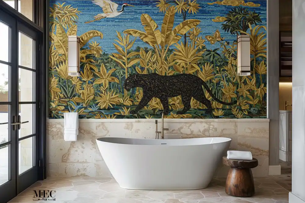 The mural is more than decoration it is a story frozen in art, merging exotic wilderness with fine mosaic craftsmanship.