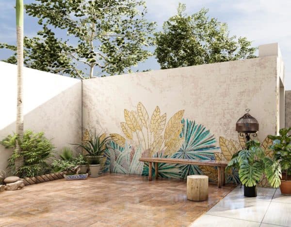 Looking to add that extra little something to your terrace area? Mosaic is always a good option since glass mosaic tiles can bear all kinds of weather, heat, cold, rain. Ideally the glass mosaic you choose for your outdoor area should be tested for thermal shock resistance and must be waterproof and frost resistant too. A design & architecture firm got in touch with us for the client’s patio wall. The area is planned to be a tiled and have potted plants and benches.