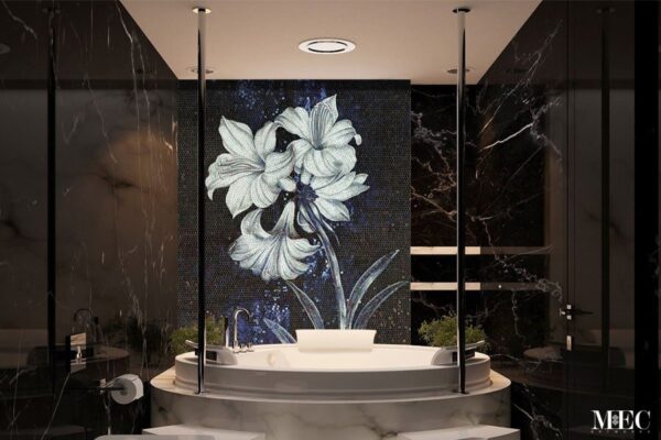 The Lilie Floral Mosaic Wall Tiles feature elegant lilies in shades of gray against a deep, textured black background. Crafted from individual tiles, the mosaic captures the delicate forms of the flowers with intricate detail. Subtle blue accents add depth. This piece brings serene beauty and sophistication to any space, creating a captivating focal point.