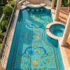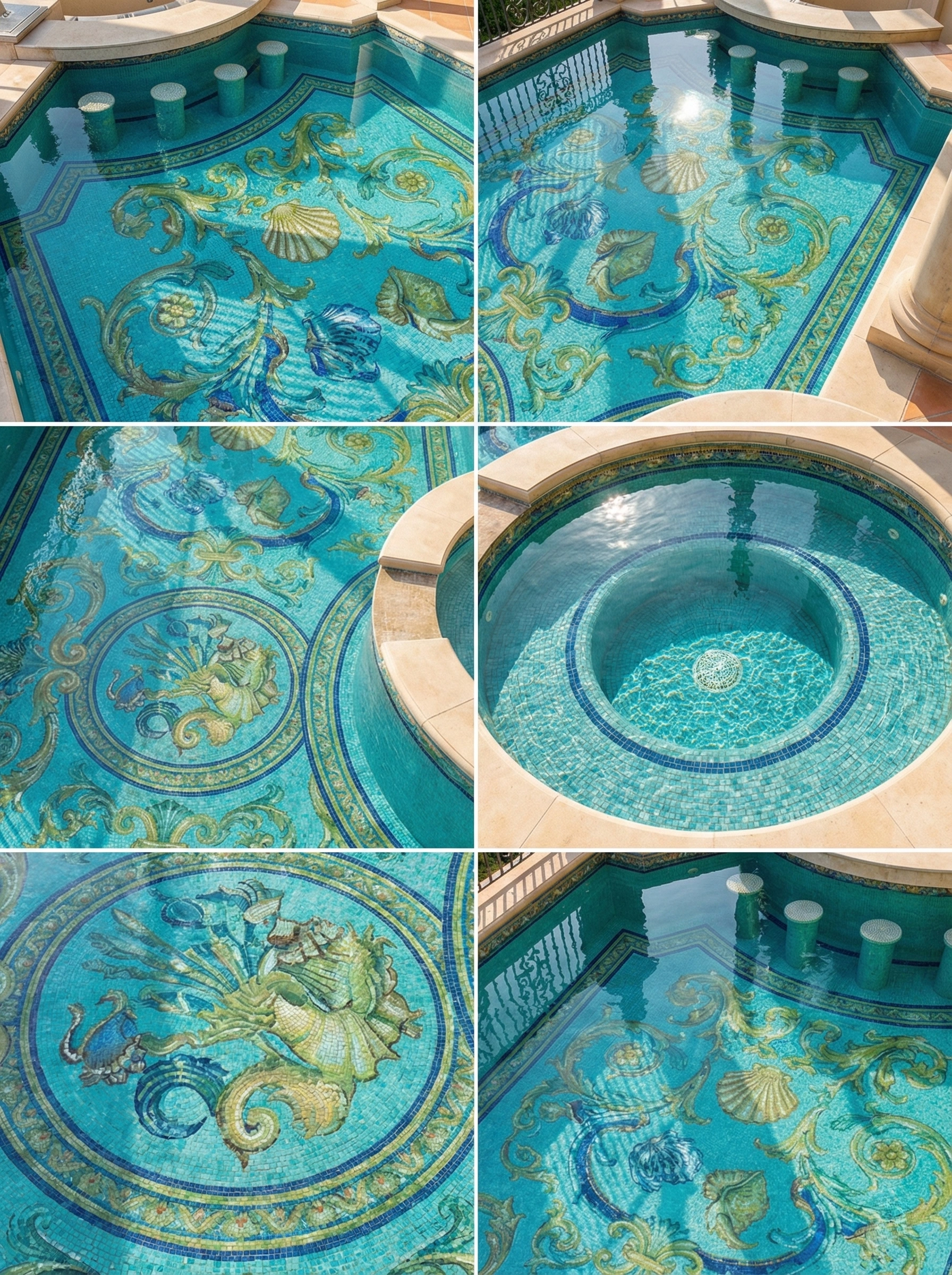 This pool mosaic creates a rich coastal look through shells, medallions, and flowing scrollwork. The gold accents add a premium shine against the aqua base. It fits luxury pools that want a detailed and artistic marine theme.