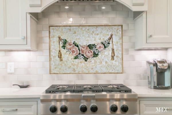 Now this is a kitchen stove wall backsplash panel that is hard to ignore. Maarse features a gorgeous pink rose valance design with tassels against an off-white and champagne, crushed glass mosaic field. For more floral mosaic art check out MECs Flora & Le Printemps collections.