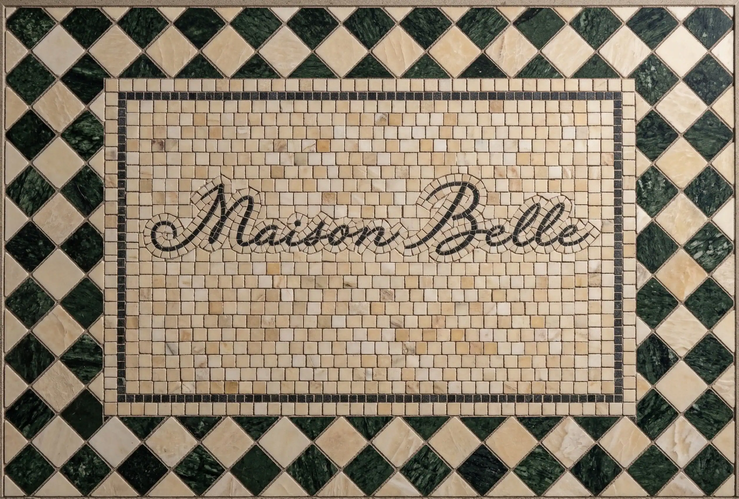 “Maison Belle” is a classic mosaic signage design that reflects timeless European elegance. Featuring refined script typography framed within a structured geometric border, this piece captures the charm of traditional craftsmanship with a warm, welcoming aesthetic.
